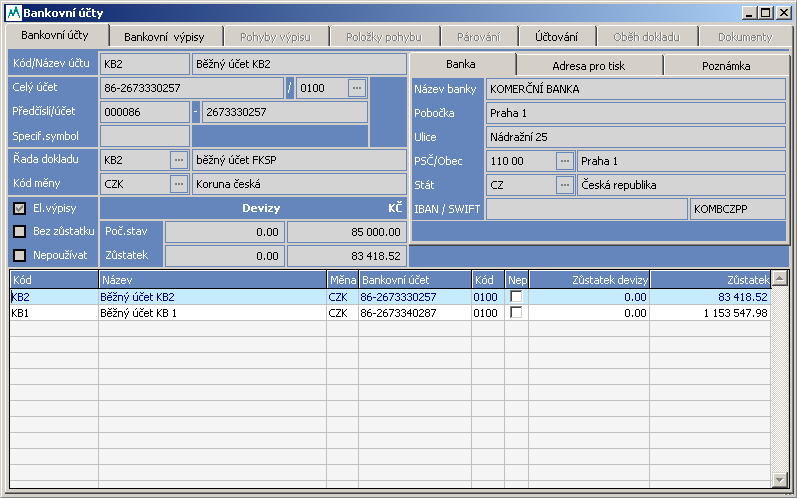 Obsahuje evidenci bankovních účtů, sledování více účtů i v cizí měně, jednotlivé a hromadné účtování, okamžité promítnutí účtování do účetního deníku, jednotlivé a hromadné párování s evidencemi závazků a pohledávek, rychlý náhled na párovaný doklad. Umožňuje opis libovolného bankovního výpisu v průběhu roku, stálou kontrola stavu bankovních účtů, načítání bankovních výpisů zaslaných v elektronické podobě z peněžního ústavu nebo zadávání vstupních dat ručně.