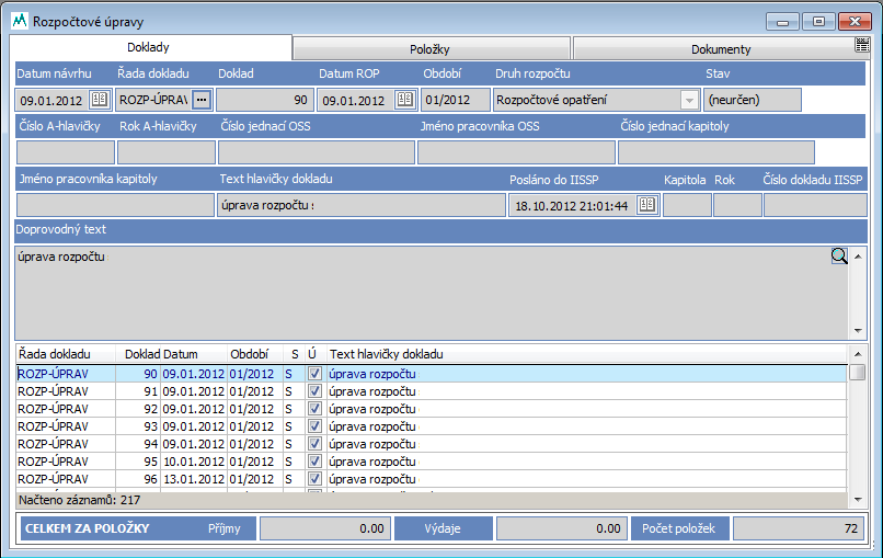 - rozpočtová opatření se změnou závazných ukazatelů nebo s přesuny mezi OSS jsou realizována pomocí tzv. A-hlavičky.